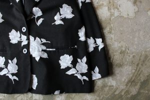 黒ベースのテーラードジャケットに白いバラがデザインされたコチラ。
